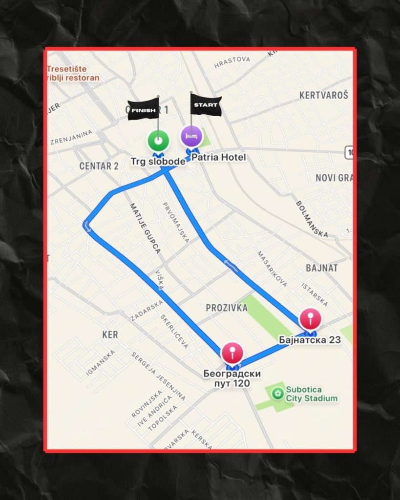 Kako se navodi na mapi koju su kreirali građani, šetaće se Beogradskim putem do Opšte bolnice Subotica. Odatle levo – ka kružnom toku u Ulicu braće Radić, a završno okupljanje je na Trgu slobode u centru grada, kod Gradske kuće.