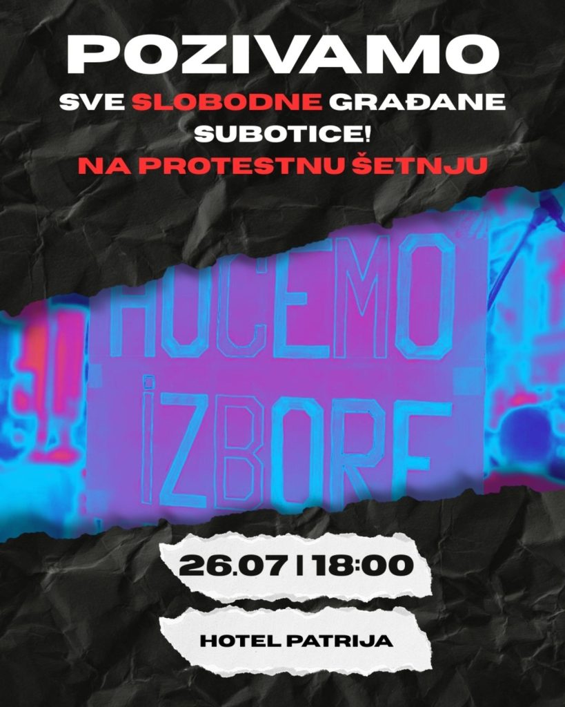 Grupa Subotičana pozvala je sve slobodne građane Subotice na protestnu šetnju u subotu, 26. jula, u 18 časova. Polazak je najavljen iz centra grada, na raskrsnici kod hotela “Patria”.
