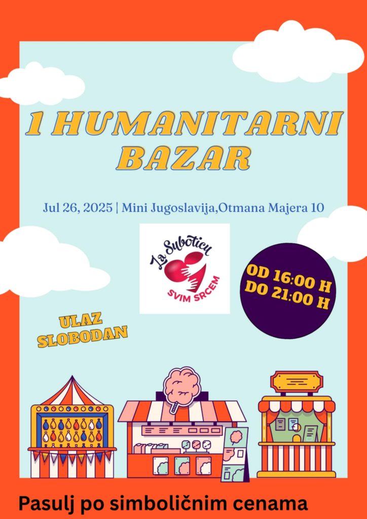 Udruženje „Za Suboticu svim srcem“ organizuje svoj prvi humanitarni bazar u subotu, 26. jula, u parku Mini Jugoslavija, u vremenu od 16 do 21 čas, sa ciljem promocije lokalnih proizvođača i ručnih radinosti i prikupljanja pomoći za rad ovog udruženja.