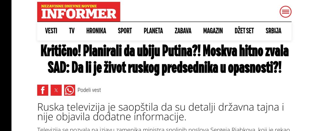 „Pokušali su da ubiju Putina! Hitno se oglasio Kremlj i otkrio šta se dešava“ senzacionalistički je naslov Kurira od novembra prošle godine. Ko je, međutim, kliknuo na njega, odmah u lidu je shvatio da je izmanipulisan jer se kaže “Predstavnici Ukrajine na najrazličitijim nivoima mnogo puta su pokušali da na rečima ubiju predsednika Rusije Vladimira Putina, ali ništa od toga, izjavio je portparol ruskog predsednika Dmitrij Peskov”.