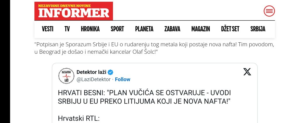 Tako je letos Informer iskoristio temu iskopavanja litijuma u Srbiji i povezao je sa uvek interesantnom za “podgrejati” o netrpeljivosti između Hrvata i Srba i naročito interesantnom u prorežimskim medijima o svetu ljubomornom na uspehe naše države, pa je uz naslov „Hrvati besni! Plan Vučića se ostvaruje – uvodi Srbiju u EU preko litijuma koji je nova nafta” objavljen i manipulativni snimak od izmontiranih segmenata sa RTL televizije, kao i tekst koji ukazuje na to da je hrvatska televizija zavidno govorila samo u pozitivnom kontekstu o iskopavanju litijuma u Srbiji.