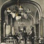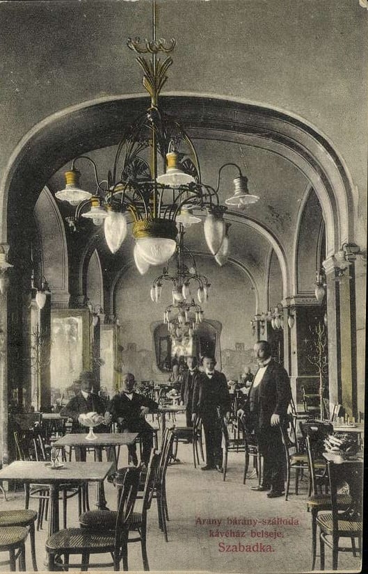 Enterijer kafane u Hotelu “Zlatno jagnje” (Korzo 3) može nam približiti ideju kako je mogao izgledati enterijer restorana u zgradi pozorišta na prekretnici 19. u 20. vek (Zbirka razglednica – Istorijski arhiv Subotice)