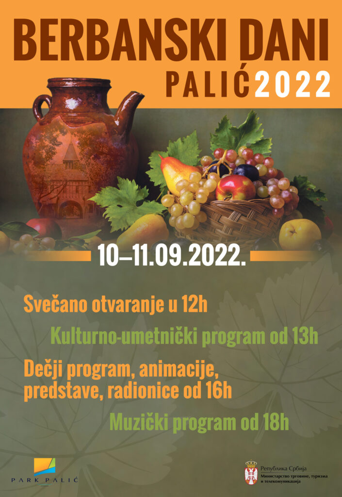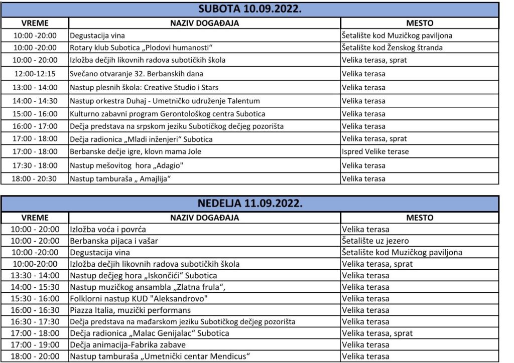 Tradicionalna manifestacija „Berbanski dani”, koji se organizuju u čast berbe svih plodova koji dospevaju u našim krajevima, biće održana ovog vikenda, 10. i 11. septembra, na Velikoj terasi na Paliću, kao i na šetalištu uz obalu jezera.
