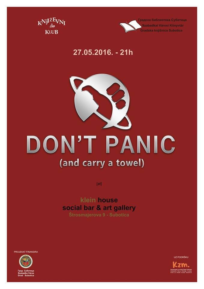 U znak proslave Međunarodnog dana peškira kao i najznačajnije knjige koju je ikada objavila velika izdavačka korporacija na Ursa Minoru i genija Daglasa Adamsa “Autostoperski vodič kroz galaksiju”, Književni klub Urlik i Gradska biblioteka Subotica organizuje žurku “BEZ PANIKE”.