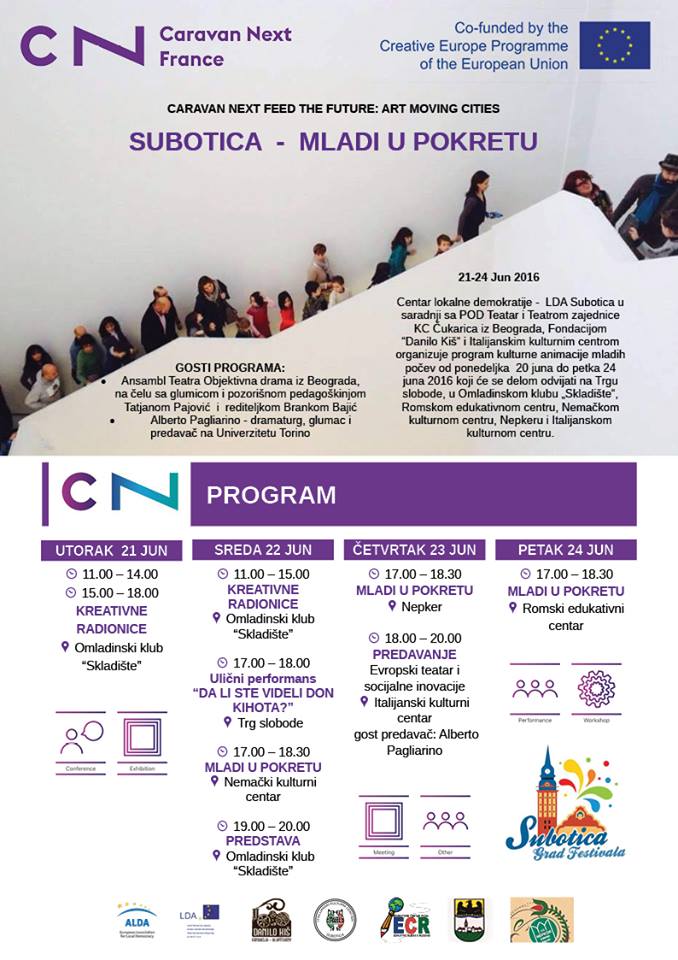 Centar lokalne demokratije – LDA Subotica u saradnji sa POD Teatrom Beograd, Fondacijom “Danilo Kiš“ i Italijanskim kulturnim centrom organizuje program kulturne animacije mladih koji traje do petka, 24. juna. Program se delom odvija na Trgu slobode, u Omladinskom klubu „Skladište“, Romskom edukativnom centru, Nemačkom kulturnom centru, Nepkeru i Italijanskom kulturnom centru.
