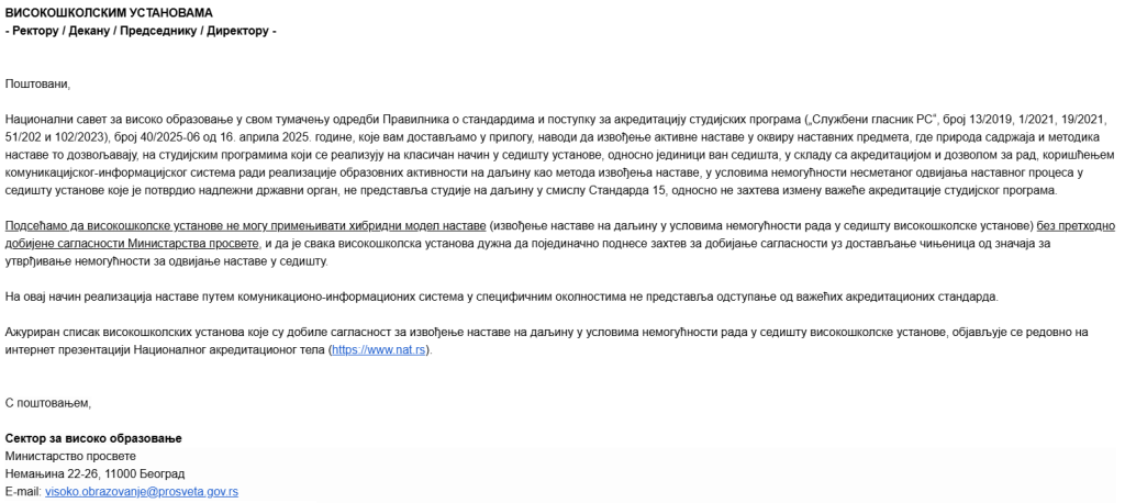 Direktorka Visoke škole strukovnih studija za obrazovanje vaspitača i trenera u Subotici Vlasta Lipovac Kerić demantovala je danas za Magločistač izjave studenata u blokadi ove škole, koji su 25. aprila na protestu tvrdili da škola nema akreditaciju za održavanje onlajn nastave, i navela da je onlajn nastava u ovoj visokoškolskoj ustanovi u potpunosti u skladu sa zakonom, te da su za njeno sprovođenje dobijena sva neophodna odobrenja od strane Ministarstva prosvete i Nacionalnog akreditacionog tela (NAT).
