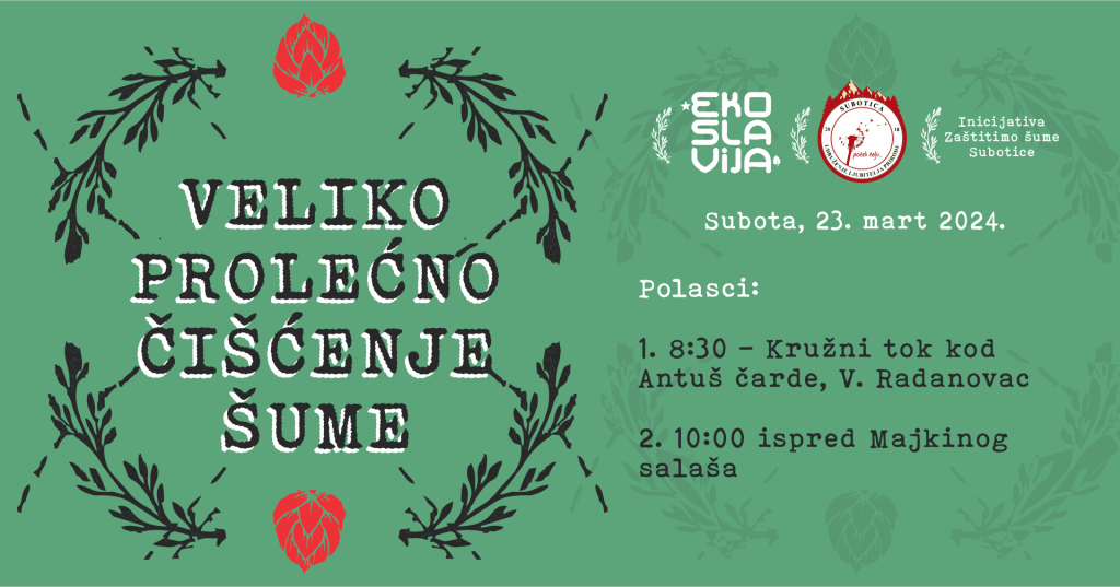 Udruženje „Ekoslavija“, „Poželi Želju“, inicijativa „Zaštitimo šume Subotice“ i Planinarsko društvo „Panonci“ iz Subotice, održaće akciju čišćenja šume „Subotičke Peščare“ na dve lokacije u subotu, 23. marta, i pozivaju Subotičane da im se pridruže.