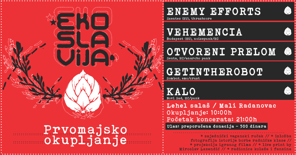 Udruženje Ekoslavija će u okviru obeležavanja Međunarodnog praznika rada, u sredu, 1. maja, na Lehel salašu, od 10 časova pa do kasno u noć, proslaviti i prisetiti se radničke borbe pod ovogodišnjim motom „Gradimo zajednicu. Negujemo underground izraz. Promovišemo Ekoslaviju #5“.