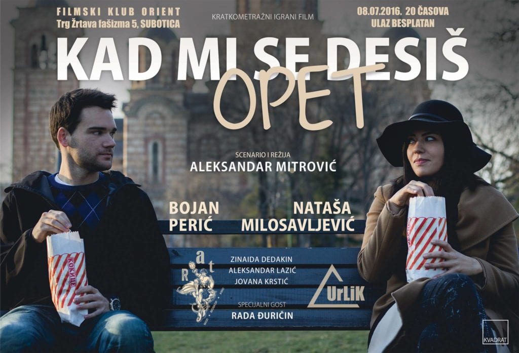 Premijera kratkometražnog filma “Kad mi se desiš opet” Aleksandra Mitrovića biće održana u petak, 8. jula, u Filmskom klubu “Orient” (nekadašnja biletarnica starog bioskopa Lifka, Trg Žrtava Fašizma 5) sa početkom u 20 časova.