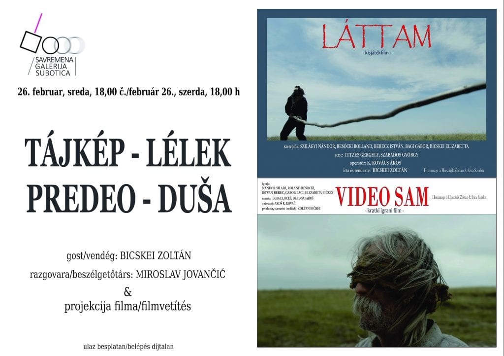 U Savremenoj galeriji Subotica će u sredu, 26. februara, u 18 časova biti održano filmsko veče pod nazivom „Predeo – duša“. U okviru večeri biće prikazan kratki igrani film „Video sam“ reditelja Zoltana Bičkeija, a nakon projekcije uslediće razgovor sa rediteljem.
