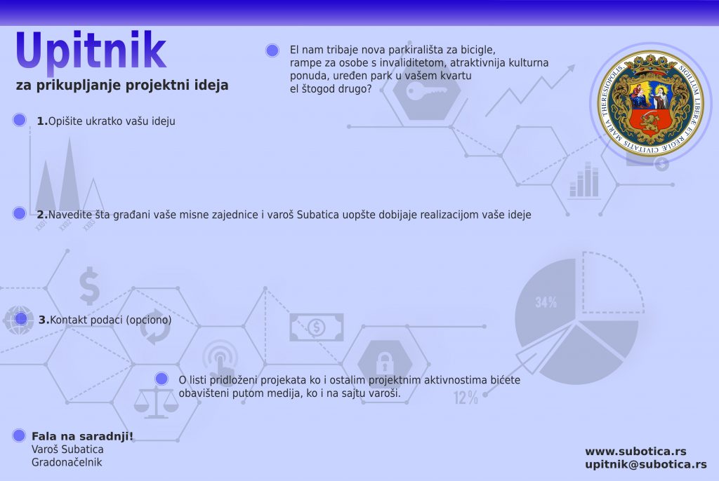 Popunjene upitnike potrebno je ubaciti u najbližu kutiju za prikupljanje predloga, dok se elektronska verzija Upitnika nalazi na sajtu www.subotica.rs, a tako popunjen upitnik se šalje na mejl adresu upitnik@subotica.rs.