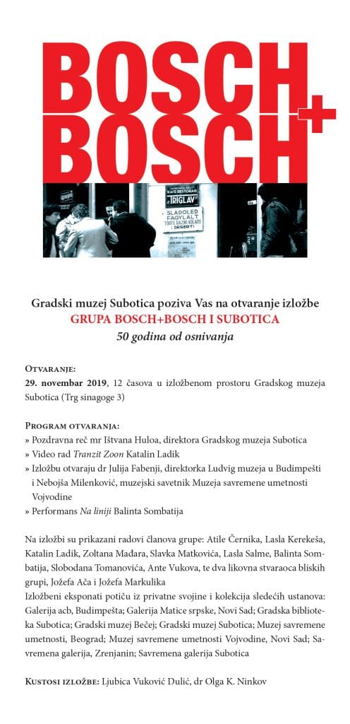 U izložbenom prostoru Gradskog muzeja Subotica (Trg sinagoge 3) u petak, 29. novembra, s početkom u 12 sati, biće otvorena izložba posvećena Grupi Bosch+Bosch, čiju realizaciju su pomogli Ministarstvo kulture Republike Srbije i Grad Subotica.