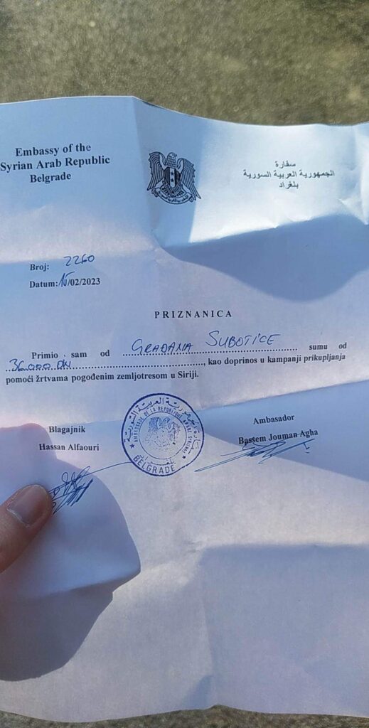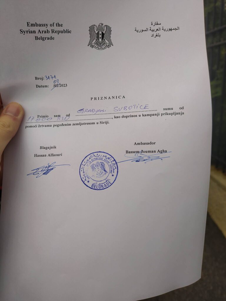 Samoorganizovana grupa Subotičana je nakon razornih zemljotresa, koji su početkom februara pogodili Tursku i Siriju, prikupila ukupno 53.000 dinara za stradale u Siriji. Donacija je preusmerena ambasadi ove države.