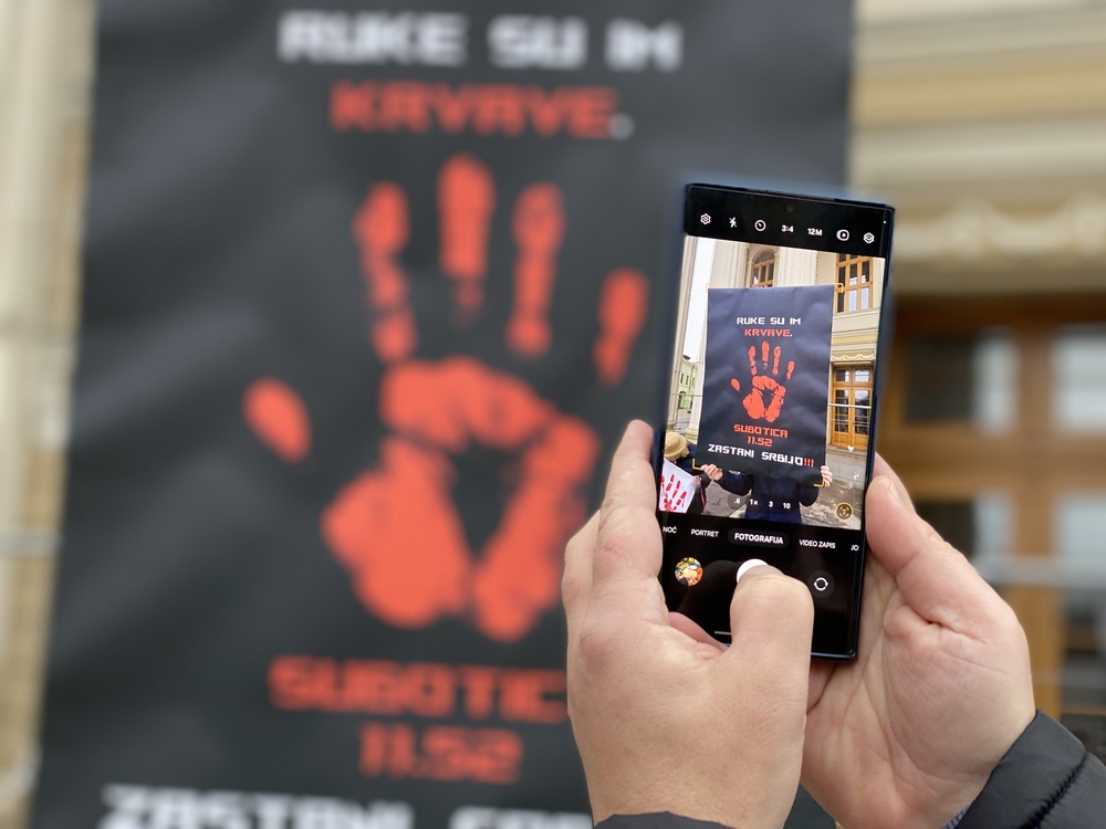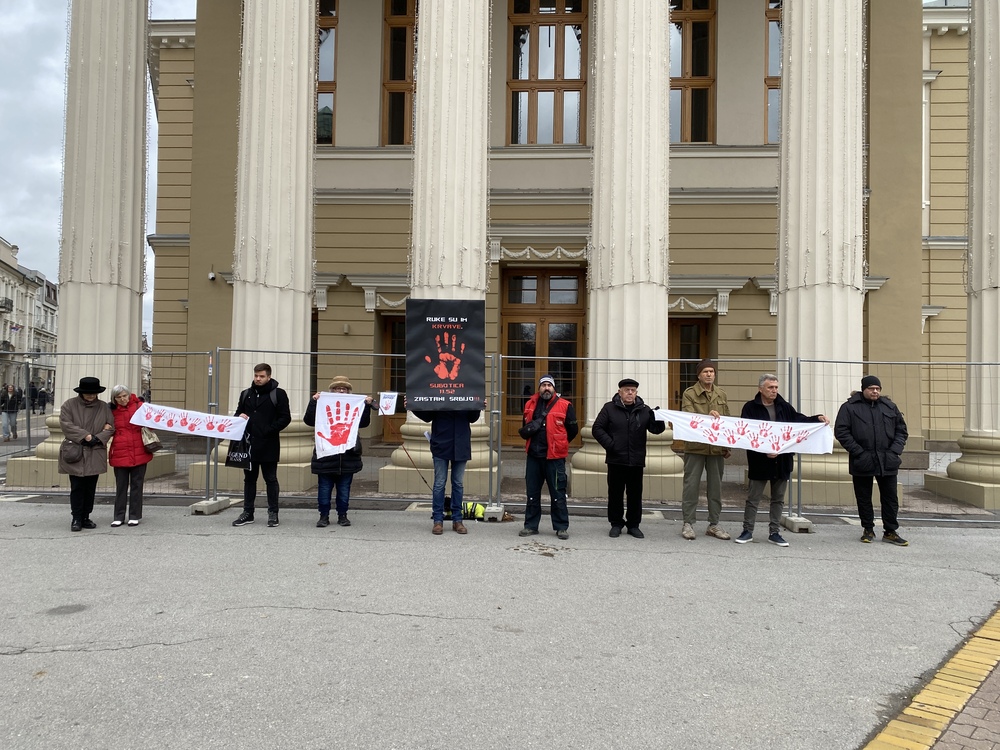 Građani su mirno stajali ispred zgrade Narodnog pozorišta držeći crni transparent na kom je crveni dlan sa natpisom „Ruke su im krvave“, kao i belu tkaninu na kojoj je otisak crvenih dlanova.