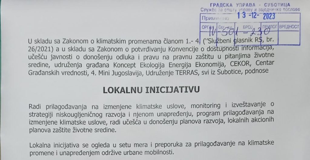 Grupa subotičkih udruženja građana koju čine Koncept Ekologija Energija Ekonomija (Koncept EEE), CEKOR, Centar građanskih vrednosti, 4. Mini Jugoslavija, i Arhus centar Subotica podnela je danas lokalnoj samoupravi inicijativu koja obuhvata predloge mera koje treba inkorporirati u lokalne politike u domenu zaštite životne sredine, a sa ciljem prilagođavanja na izmenjene klimatske uslove koje su već zakucale na vrata.