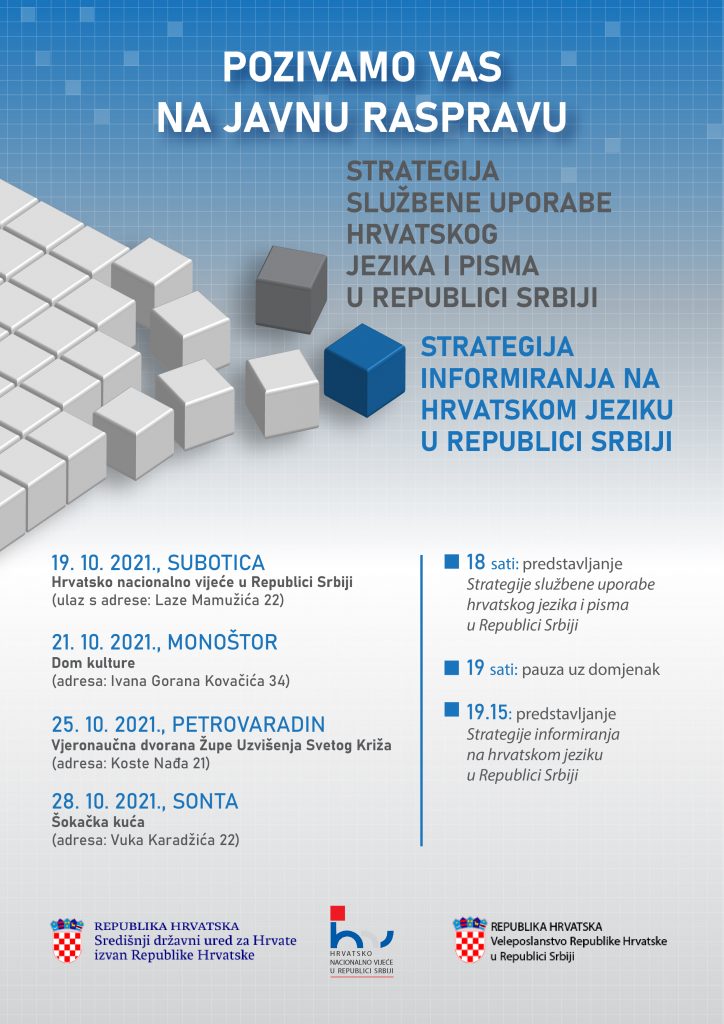 Hrvatsko nacionalno veće organizuje javnu raspravu o Strategiji službene upotrebe hrvatskog jezika i pisma u Republici Srbiji i Strategiji informisanja na hrvatskom jeziku.