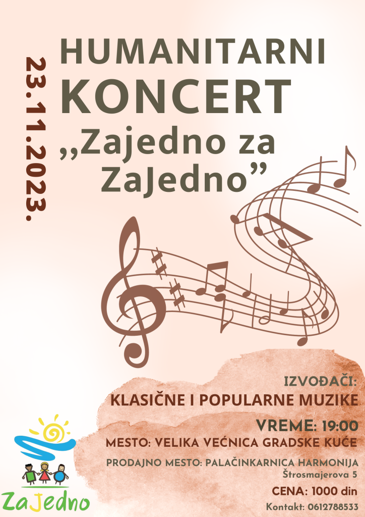 U Velikoj većnici Gradske kuće u Subotici, u četvrtak, 23. novembra, održaće se s početkom u 19 sati koncert klasične i popularne muzike u sklopu humanitarne akcije “Zajedno za ZaJedno”, koji organizuje istoimeno udruženje za podršku osobama sa psihofizičkim smetnjama u razvoju grada Subotice.