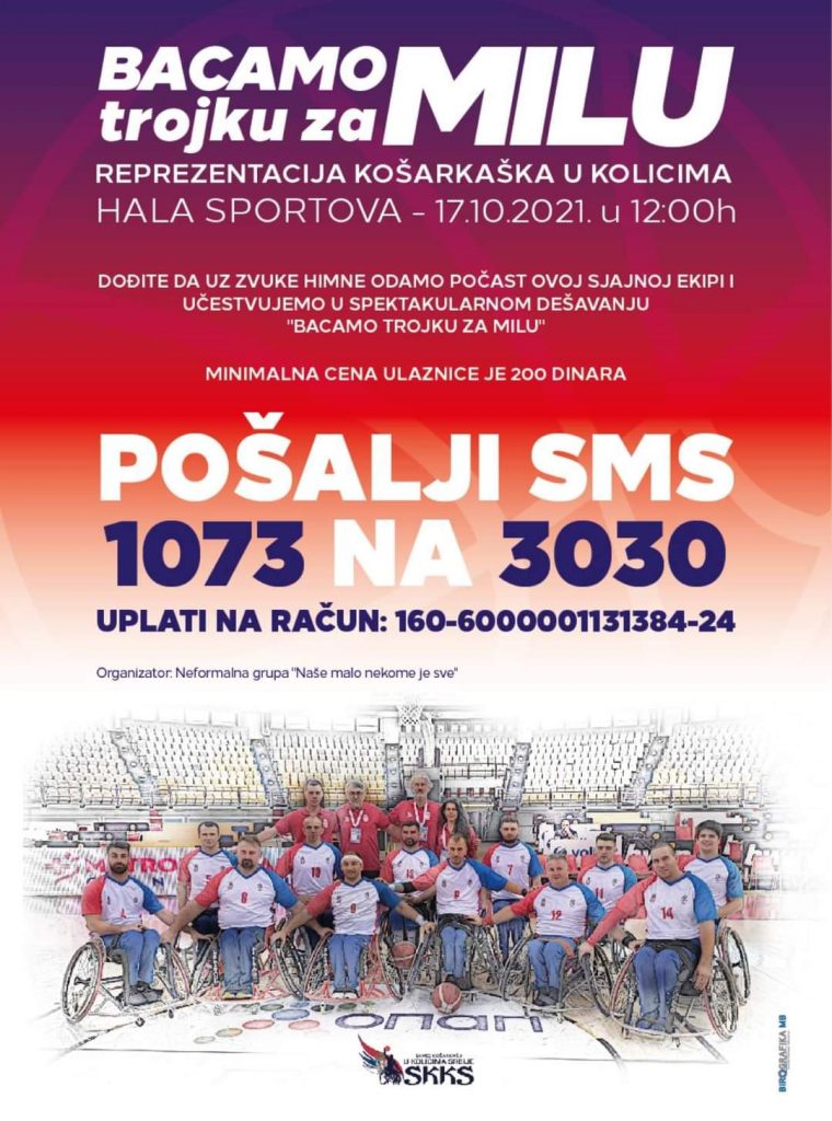 U nedelju, 17. oktobra, u Hali sportova će se održati humanitarna utakmica reprezentacije košarkaša u kolicima, a sav prihod od ulaznica namenjen je za lečenje male Subotičanke Mile Mikulić.