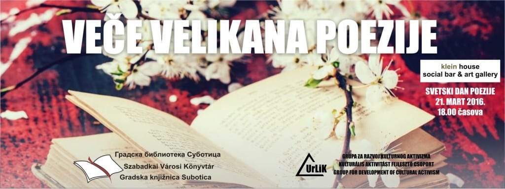 U okviru Svetskog dana poezije Gradska biblioteka Subotica i Grupa za razvoj kulturnog aktivizma Urlik će u ponedeljak, 21. marta, u prostorijama Klein house-a održati Veče velikana poezije. Program počinje u 18 časova. Ulaz je besplatan.