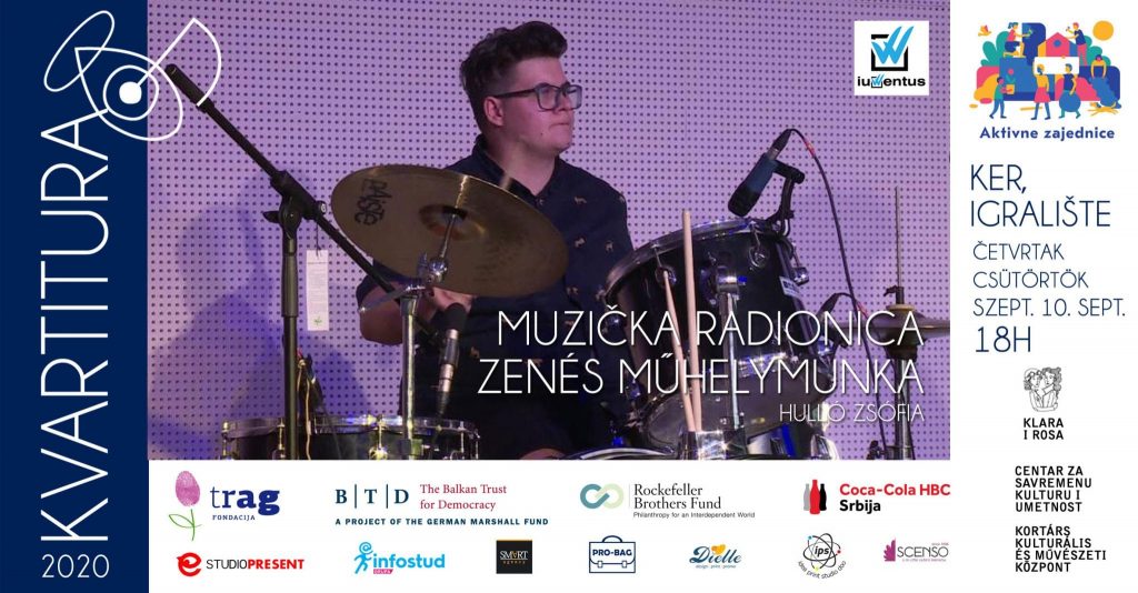 Pod sloganom „U septembru kulturni događaji gostuju u vašem kvartu!“, u okviru programa „Kvartitura 2020“, za četvrtak, 10. septembar, Udruženje “Klara i Rosa” najavljuju muzičku radionicu koju će na igralištu u Keru u Leskovačkoj ulici, sa početkom u 18 sati, održati Žofia Hulo ispred Udruženja “Iuventus Ventus”.