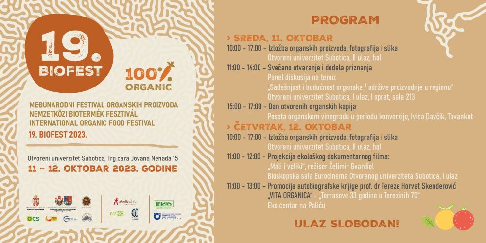 Po 19. put, Udruženje “Terra’s” i Otvoreni univerzitet Subotica organizuju Međunarodni festival organskih proizvoda “Biofest”, koji će biti održan 11. i 12. oktobra na više različitih lokacija.