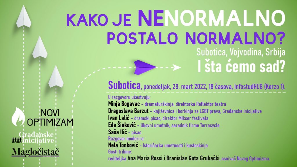 U organizaciji Novog Optimizma, a uz podršku Građanskih inicijativa i Magločistača, u Subotici će u ponedeljak, 28. marta, u InfostudHub-u, sa početkom u 18 sati, biti održana tribina “Kako je nenormalno postalo normalno?”.
