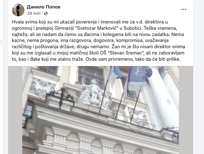 “Novi vršilac dužnosti direktora subotičke Gimnazije obratio se kolektivu škole preko svog Fejsbuk profila”