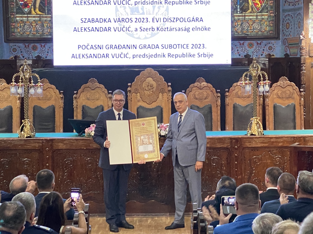 Gradonačelnik Subotice Stevan Bakić uručio je danas, na svečanoj sednici Skupštine, povodom Dana grada, predsedniku Srbije Aleksandru Vučiću zvanje Počasnog građanina Subotice.