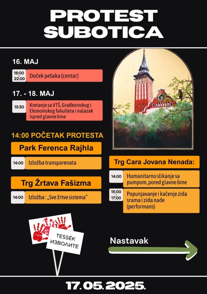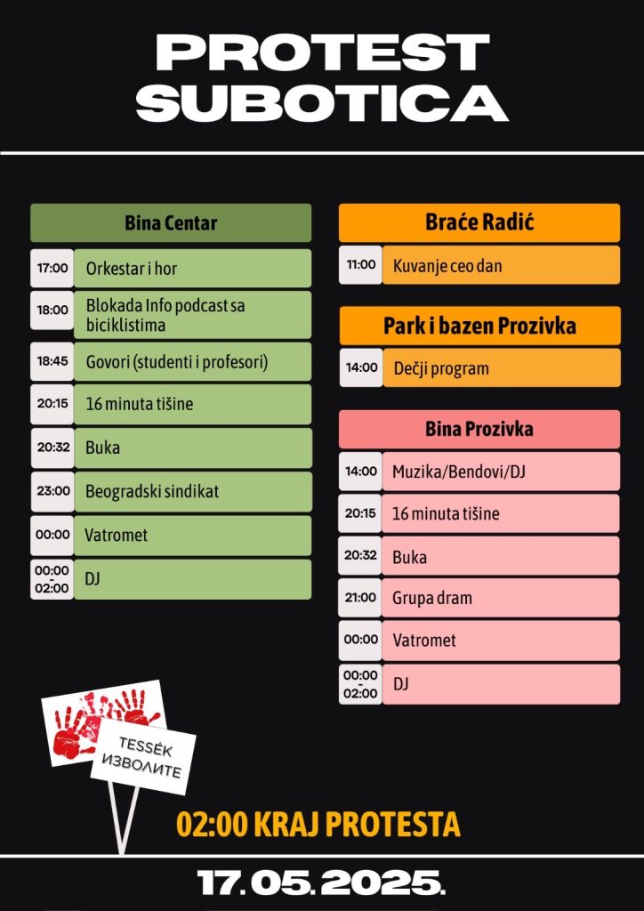 Studenti u blokadi najavili su program velikog protesta pod nazivom „U Subotici smo SVI“ koji će u subotu, 17. maja, biti održan u Subotici, na više lokacija, sa početkom u 14 časova i trajaće do 2 ujutro. Doček studenata pešaka koji dolaze iz drugih gradova Srbije predviđen je dan ranije, u petak, 16. maja, od 20 časova, na centralnom gradskom trgu.