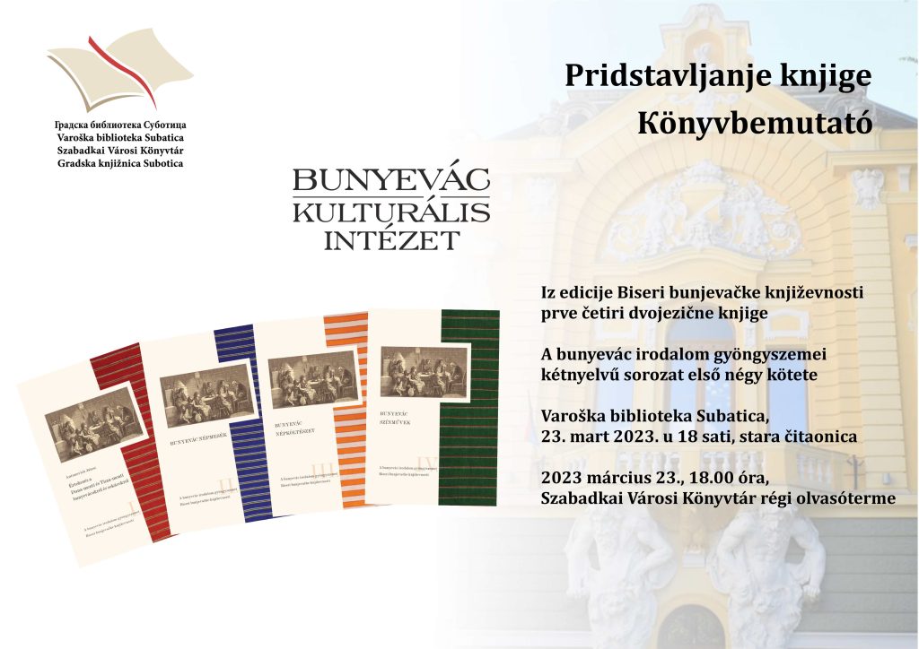 U staroj čitaonici Gradske biblioteke Subotica, u četvrtak, 23. marta, s početkom u 18 sati, biće održana promocija prve četiri knjige iz edicije “Biseri bunjevačke književnosti”.