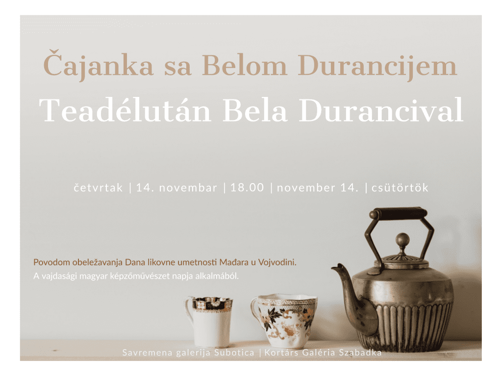 Povodom Dana likovne umetnosti Mađara u Vojvodini u četvrtak, 14. novembra, u 18 sati u Savremenoj galeriji Subotica održaće se čajanka sa Belom Durancijem, istoričarom umetnosti.