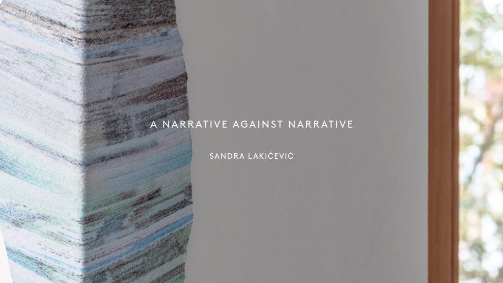 Izložba multimedijalne umetnice Sandre Lakićević „A Narrative against narrative“ objedinjuje seriju radova „Talking fibres“ (2020), video instalaciju „From ’already no longer’ to ‘not yet’“ (2020), performans/video instalaciju „Lag“ (2019) i dokument performansa „Meet me at 2“ (2023). Odbacivanje ili dekonstrukcija narativa je element koji se ponavlja u ovim radovima i nameće pitanje da li negacijom jednog narativa ne stvaramo samo jedan drugi oblik narativa. Onaj koji možda nema za cilj da ispriča priču iz prošlosti, ali kom prošlost neminovno daje formu.
