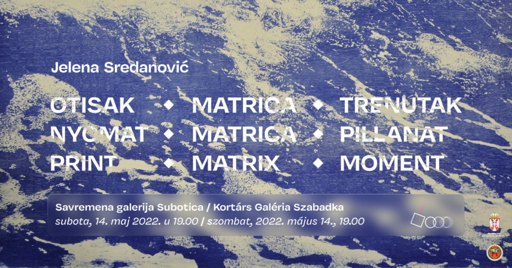 U Savremenoj galeriji Subotica će u okviru manifestacije “Muzeji za 10” u subotu, 14. maja, u 19 časova, u okviru programa za “Noć muzeja” biti otvorena izložba novosadske umetnice Jelene Sredanović pod nazivom „Otisak. Matrica. Trenutak.“.