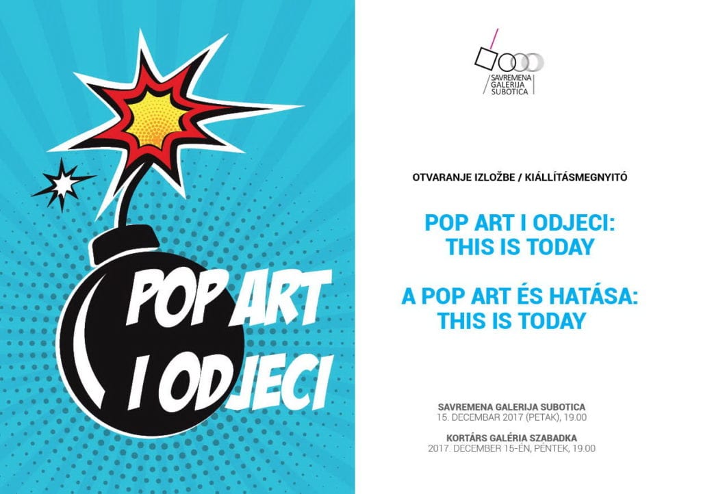 Izložba “Pop art i odjeci – This is today” biće otvorena u petak, 15. decembra, sa početkom u 19 časova, u Savremenoj galeriji Subotica. Izložba će biti otvorena do 31. januara 2018. godine.