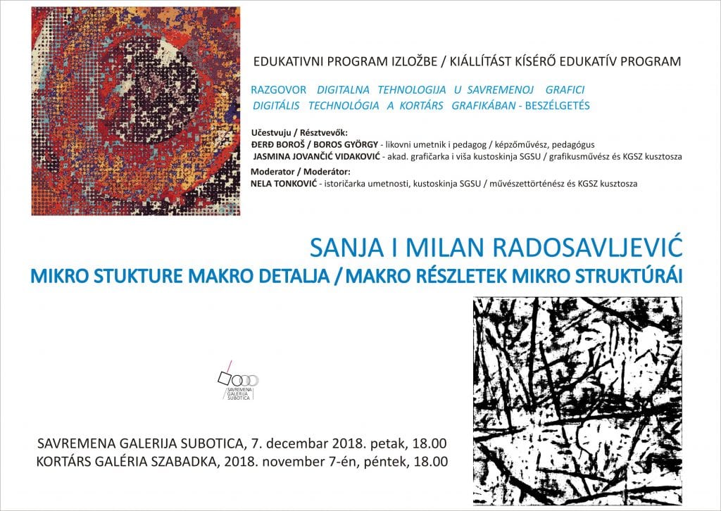 Razgovor će biti održan u okviru edukativnih programa izložbe „Mikro strukture makro detalja“ umetničkog para Sanje i Milana Radosavljević.