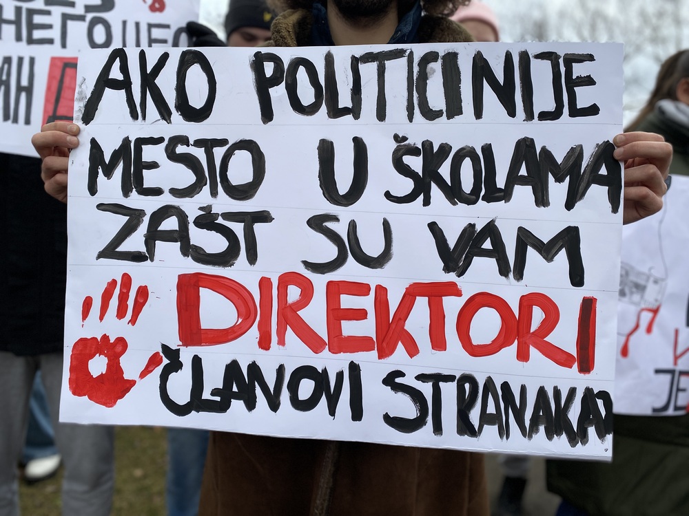 Одговор на транспарент: Држава плаћа школе, па треба и да поставља директоре, а државом увек управља изабрана власт (странка), а и многи професори су чланови странака, били за блокаде или не. Исказивање незадовољства на нешто је једно а блокада живота је нешто сасвим друго.