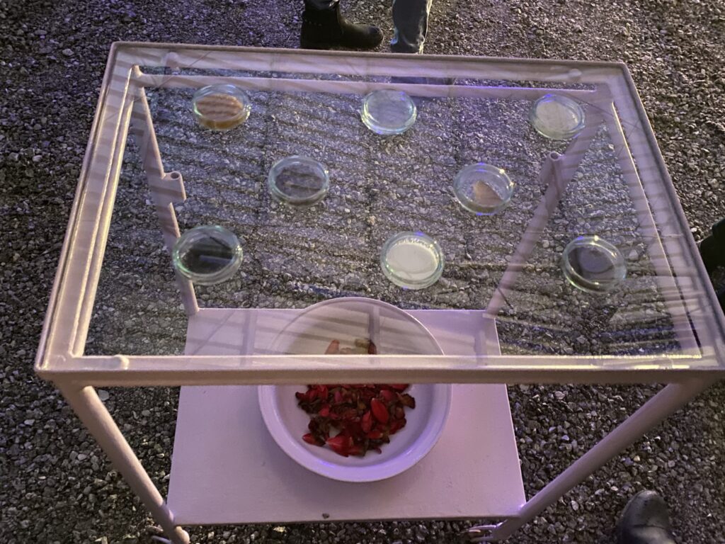 „Moj rad se zasniva na biološkom materijalu koji nastaje zapravo od fermentacije crnog ili zelenog čaja – to je kombuha. I ovaj materijal je bakterijska celuloza koja nastaje od kombuhe, a ona je jako zdrava za naš organizam, i zbog toga kao materijal i motiv je bio povezan jedan za drugi, pošto sam se borila sa nekim svojim ličnim problemima koji se vezuju za ovaj tihi oporavak. Preko ovog motiva je to prikazano, i način na koji sam se lečila, i prikazan je materijal koji koristim u svom radu“, objašnjava Ujhazi.
