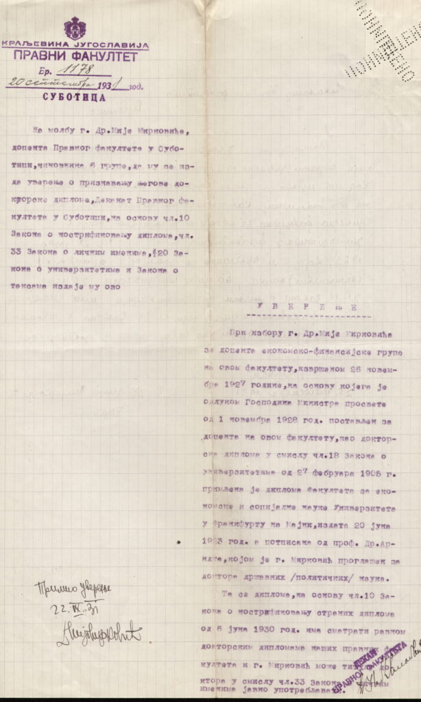Pečat koji je prof. Mijo Mirković ostavio na prvom subotičkom fakultetu dubok je i značajan. Ali mnogo su vrednije njegove ideje, dela, knjige, udžbenici, studije koje su nastajale u to doba, a koje ne gube na aktuelnosti ni danas.