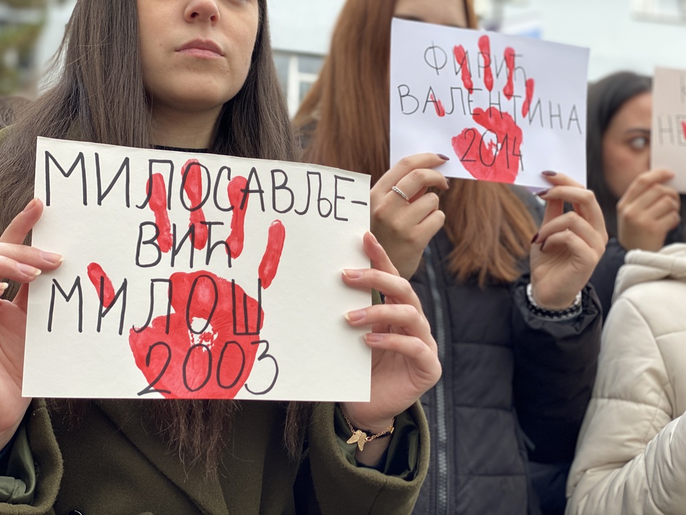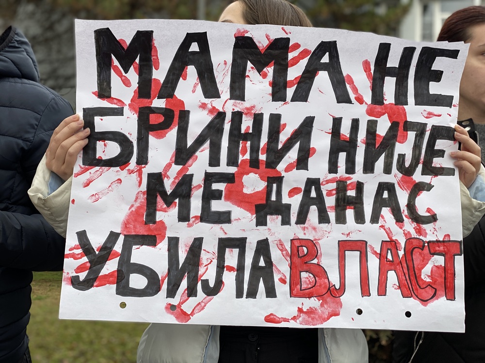 Studenti su u rukama držali crvene papire u obliku raširenog dlana sa imenima 15 žrtava novosadske tragedije i transparente na kojima piše „Mama ne brini, nije me danas ubila vlast“, „Društvo puno negativnih eksternalija“, „Kada će čas savesti?“, „Mora početi negde. Mora početi nekad. Zašto ne ovde? Zašto ne sada? Ovo je naša blokada“, „Pali ste test časti“.