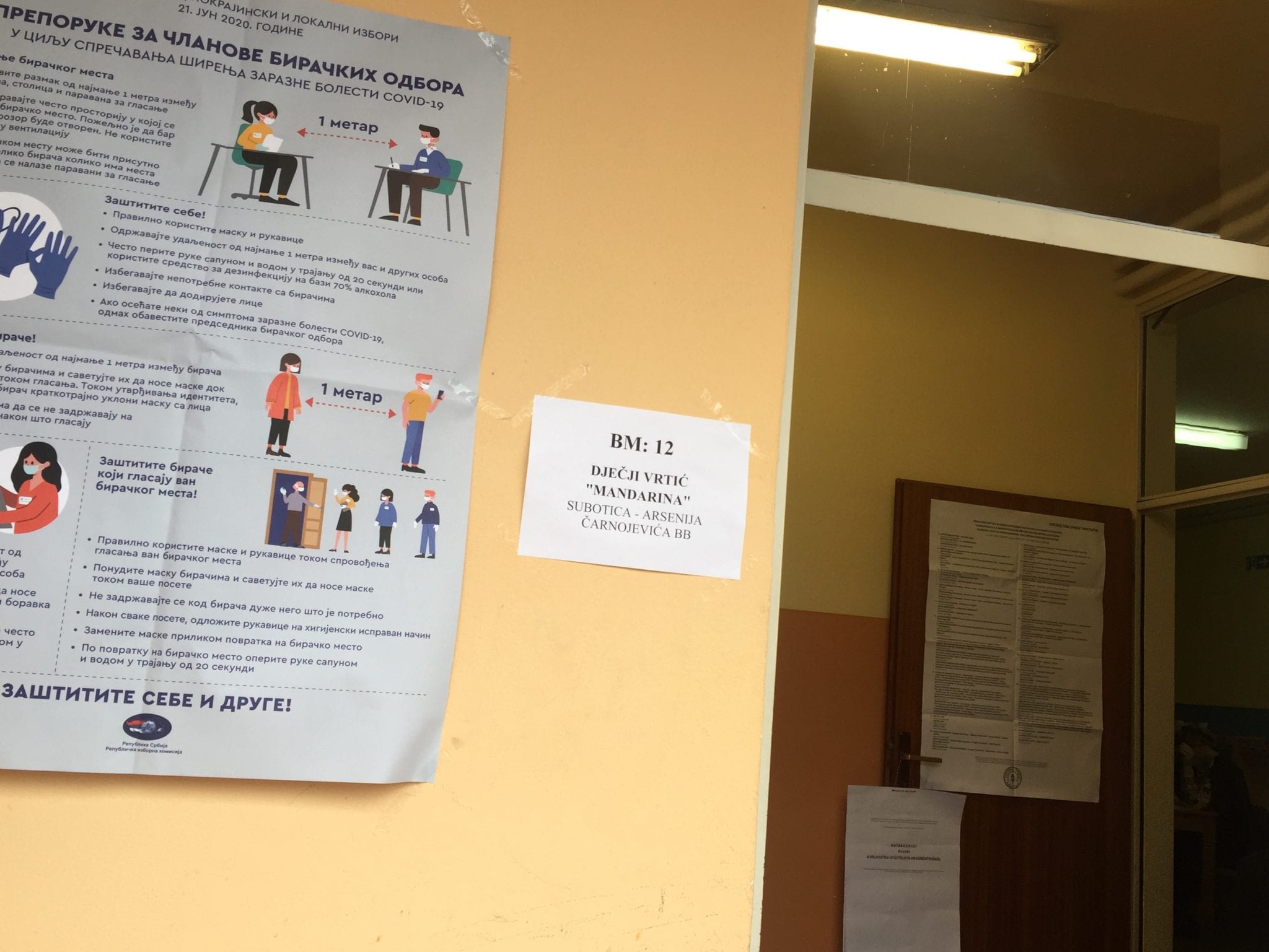 Na biračkim mestima u Subotici se pretežno poštuju propisane mere zaštite od korona virusa. Članovi biračkih odbora imaju maske, rukavice i dezinfekciona sredstva. Najveći broj građana koji ulazi na biračka mesta ima zaštitnu masku, a neki nose i rukavice.