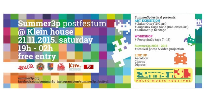 Sedam dana kasnije, u subotu, 28. novembra, na Ženskom štrandu kraj jezera Palić, biće održana žurka pod nazivom „Summer3p festival Postfestum Party” na kojoj će nastupiti pet izvođača savremene elektronske scene iz Beograda i Subotice: Mark Myself (Crossworld Records, iFace), EZZT aka WB39 (Funpro4), KIBZ & DFNDR / Speed Progress, Atonal, Ascaloon (Progessive Passion, iFace).