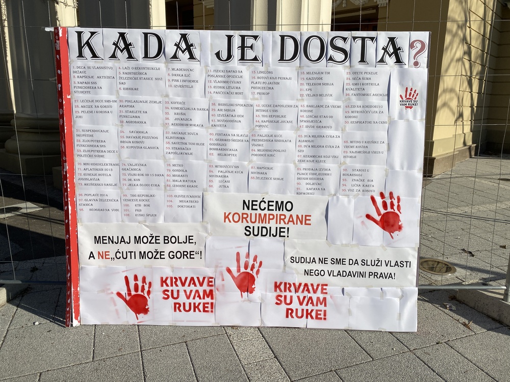 Oni su držali papire sa imenima 15 žrtava i transparente na kojima je pisalo „Kada je dosta?“, gde je su ispisane i afere koje su se poslednjih godina dogodile u Srbiji, „Menjaj može bolje, a ne, ćuti može gore“, „Nećemo korumpirane sudije“, „Sudija ne sme da služi vlasti nego vladavini prava“, „Krvave su vam ruke“.