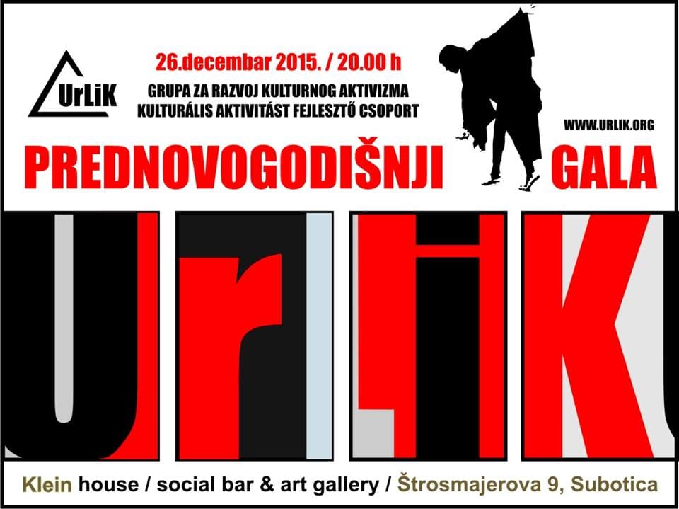 U prostoru Klein house-a u Subotici večeras u 20 časova Urlik – Grupa za razvoj kulturnog aktivizma organizuje umetnički program pod nazivom „Prednovogodišnji Gala Urlik 2015″. Ulaz je slobodan.
