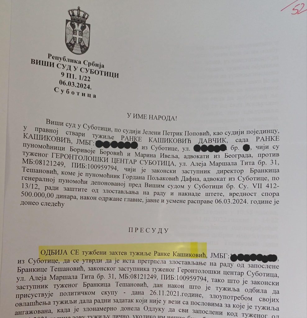 Viši sud u Subotici doneo je prvostepenu presudu kojom je u celosti odbijen tužbeni zahtev zaposlene u Gerontološkom centru Subotica Ranke Kašiković koja je protiv direktorke ove ustanove podnela tužbu za zlostavljanje na radu koje, kako navodi, trpi od novembra 2021. godine, kada je dobila SMS poruku od jedne od zaposlenih da treba da prisustvuje političkom skupu Srpske napredne stranke u Beograd – što je ona tada odbila.