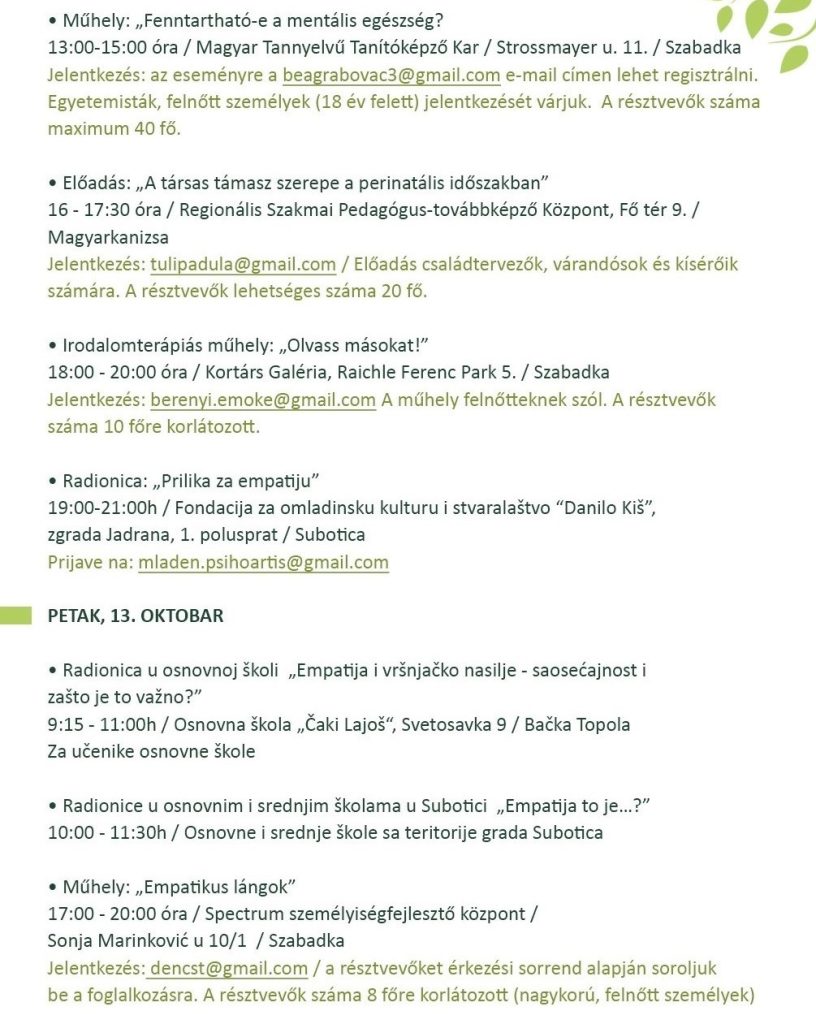 Na Svetski dan mentalnog zdravlja, koji se obeležava 10. oktobra, u Subotici će početi Festival mentalnog zdravlja, koji je ove godine posvećen – empatiji.