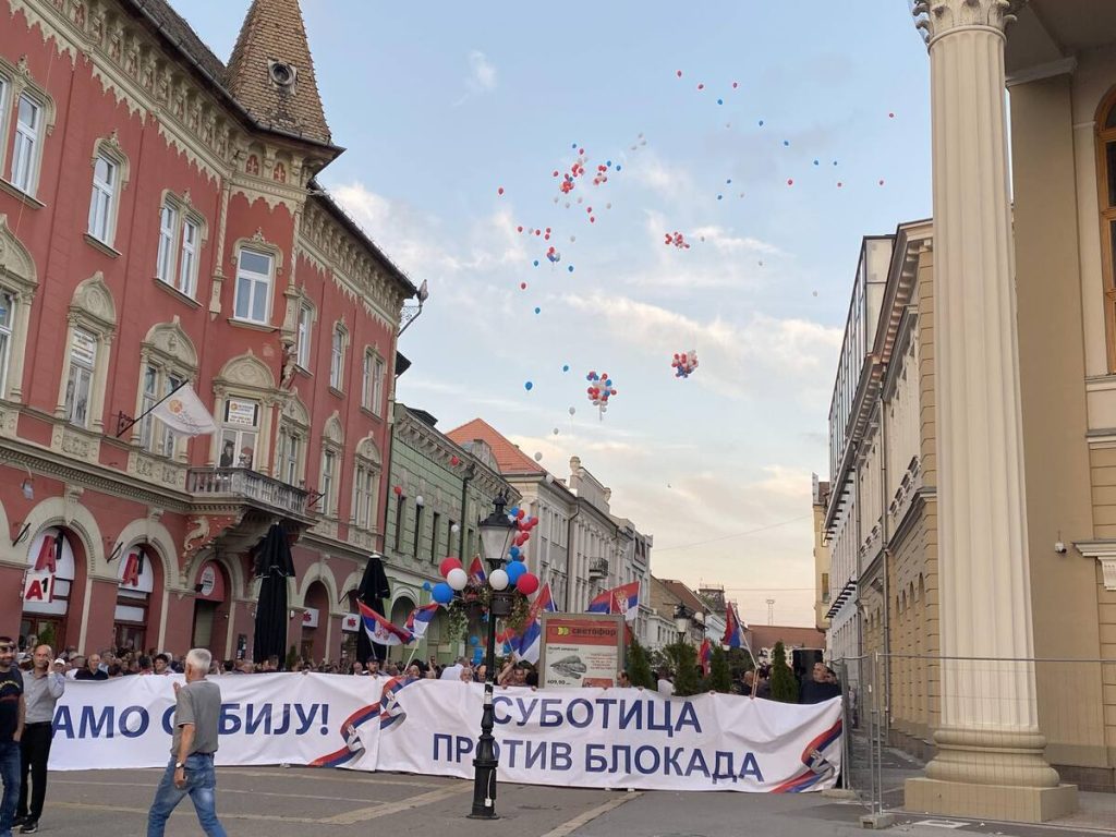 Učesnici su nosili transparente sa porukama: „Subotica protiv blokada“, „Ne damo Srbiju!“, „Bori se protiv blokada“, „Naša kuća Srbija“.