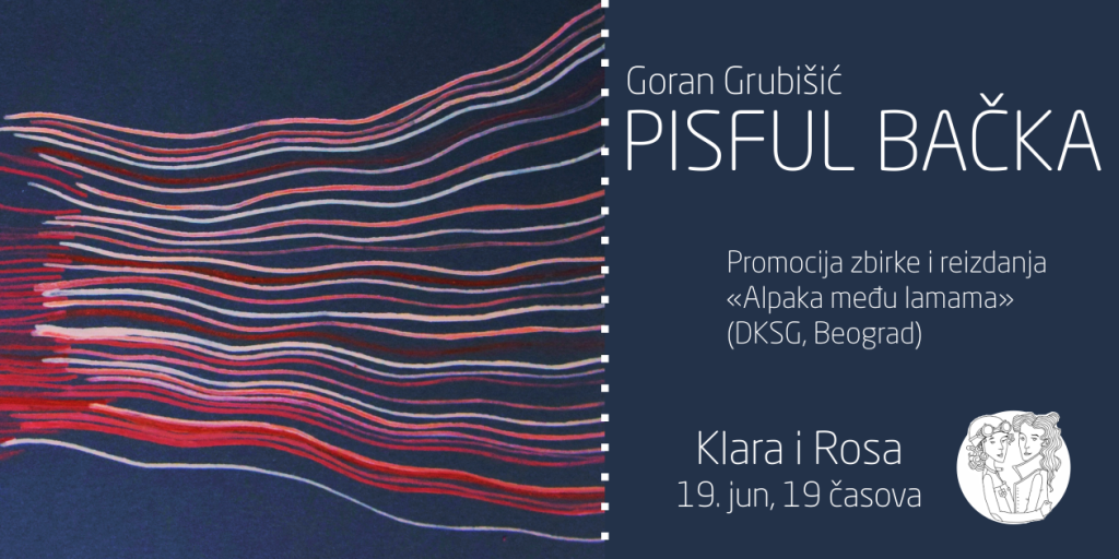 Promocija knjige subotičkog muzičara i pesnika Gorana Grubišića „Pisful Bačka“ biće održana u ponedeljak, 19. juna, sa početkom u 19 časova, u prostoru Udruženja „Klara i Rosa“. Ulaz je besplatan.