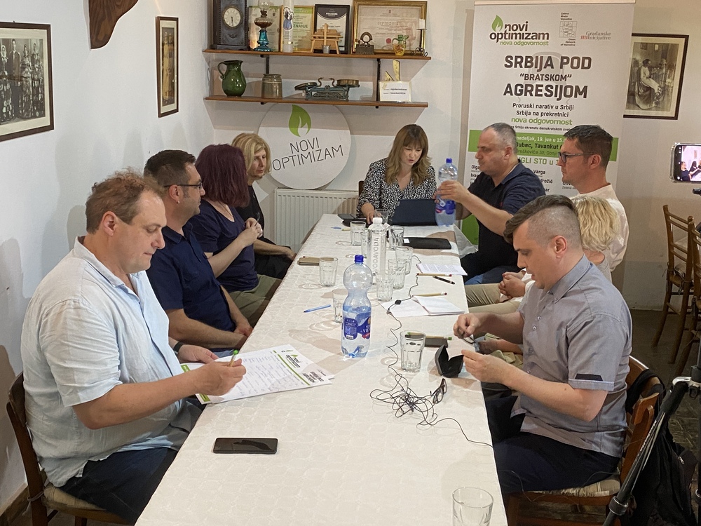 Većina građana u Srbiji i dalje nemaju relevantne informacije o stradanjima u Ukrajini i razmerama ruske agresije, zbog jakog medijskog narativa koji kontroliše Rusija uz pomoć aktuelne vlasti, poruka je sa okruglog stola „Srbija pod ‘bratskom’ agresijom”, koji je organizovao Pokret Novi Optimizam u prostorijama HKPD „Matija Gubec“, u Tavankutu.