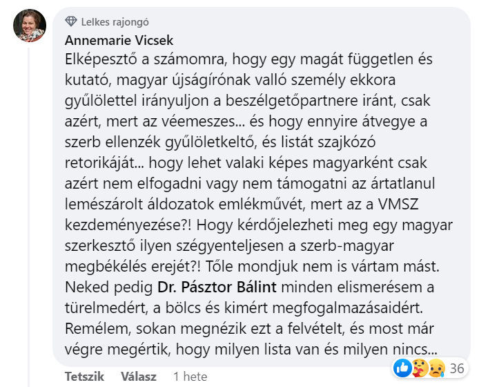 Državna sekretarka i funkcionerka SVM-a pita se i “kako može neko ko je Mađar, da ne prihvati i da ne podrži postavljanje spomenika za nevine žrtve”, i da se tako “sramno” odnosi prema “pomirenju srpske i mađarske nacije”.