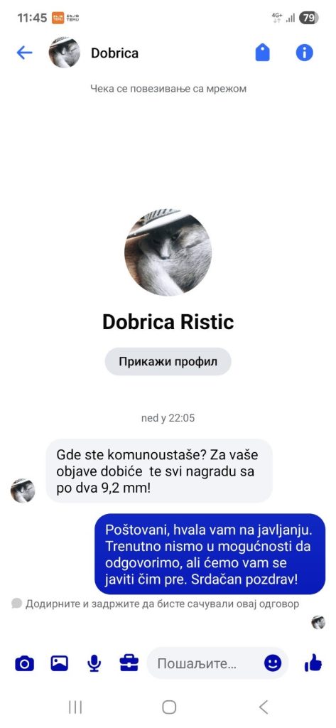 Na zvaničnu Fejsbuk stranicu ovog portala stigla je poruka od osobe koja se na društvenoj mreži predstavlja kao Dobrica Ristić.